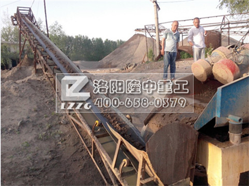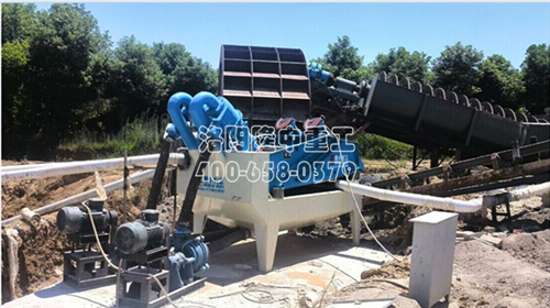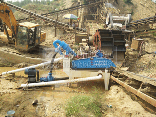 安徽宣城水洗砂生產線工藝流程:給料機+顎式破碎機+圓錐破碎機+制砂機+振動篩+螺旋洗砂機+葉輪式洗砂機,在此基礎上隆中重工為該客戶配置了雙泵型LZ-550細沙回收機一臺(如圖)。安